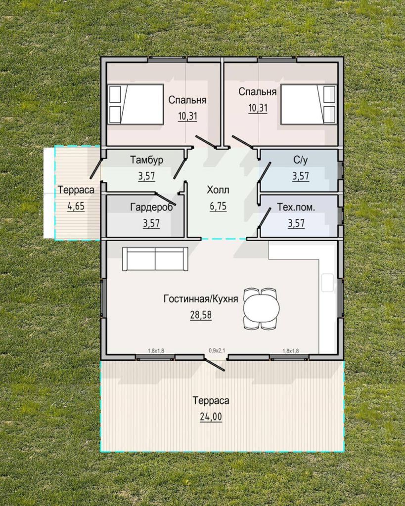 - Терраса (24 м² + 4,6 м² сбоку). Представьте: утренний кофе с видом на рассвет, вечерние посиделки с друзьями, шашлык по выходным… В общем, всё, что делает жизнь прекрасной.