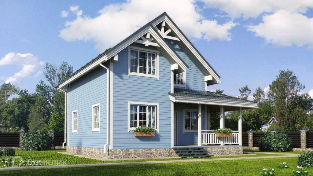 - Стены — деревянный каркас небесного цвета. Словно дом решил поиграть в облачко, но остался на земле.