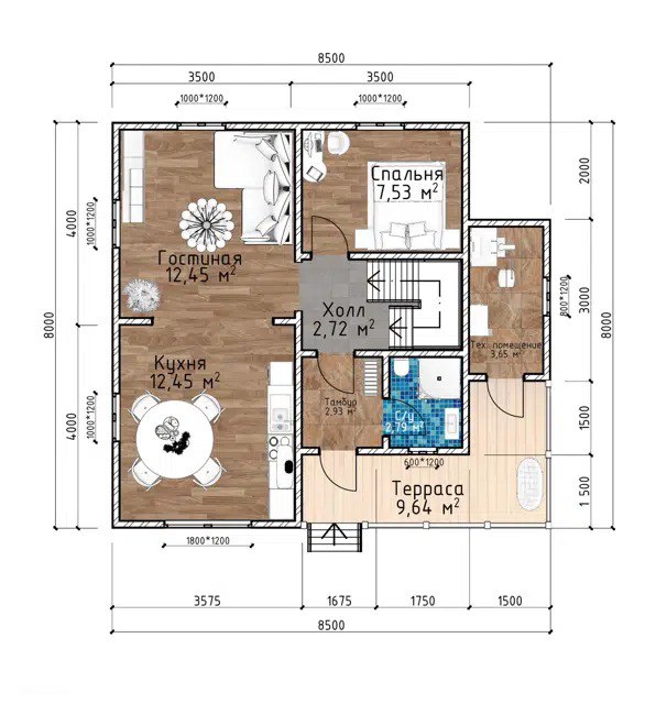 - Гостиная (12,45 м2) — тут хватит места и для семейного киновечера, и для внезапного танцевального баттла.
