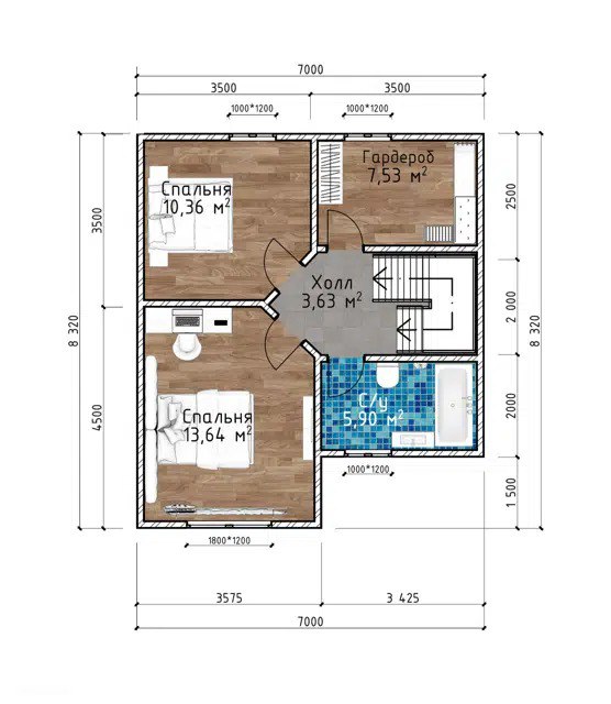 - Холл (3,63 м2) — перекрёсток второго этажа, откуда можно отправиться в любую из спален.