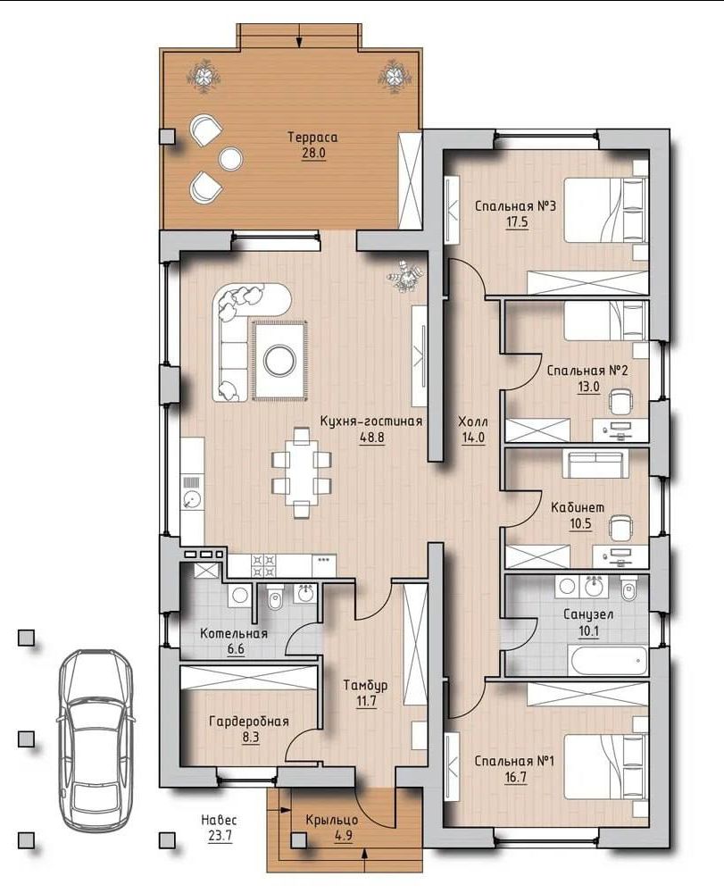 - Навес для авто (23,7 м2) — потому что машина тоже заслуживает крыши над головой. И не просто крыши, а стильной!