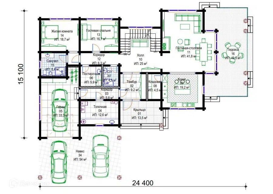 - Гараж на одно авто + открытая парковка на два — все машины будут в тепле и под навесом.
