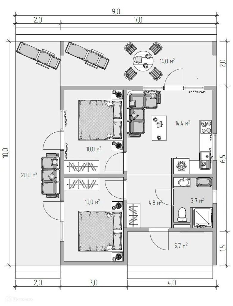 - Функциональность. Две спальни позволяют разместить семью или гостей, а оставшееся пространство можно организовать под гостиную, кухню и санузел. Планировка легко адаптируется под ваши нужды — например, одну из спален можно превратить в кабинет или игровую зону.