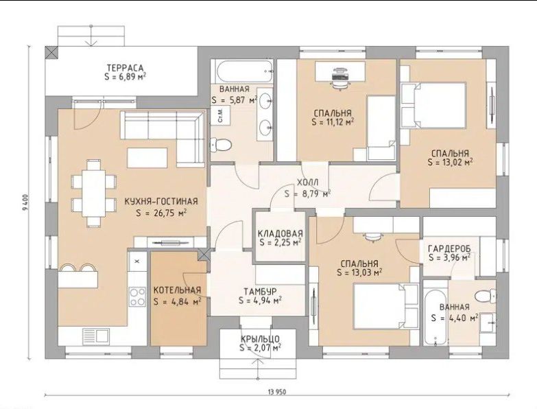 - 113 м² общей площади — достаточно, чтобы устроить танцевальную битву в гостиной, но не настолько много, чтобы заблудиться по пути на кухню.