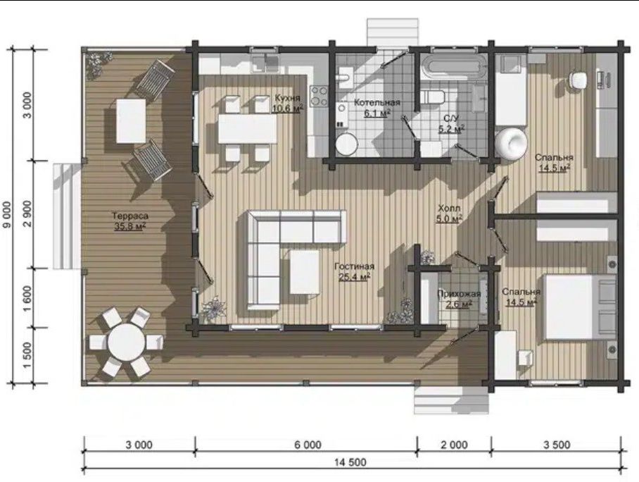 - Всё в одном уровне. Завтрак на кухне, кино в гостиной, сон в спальне — и никуда не надо подниматься. Идеально для тех, кто ценит комфорт и не любит лишние движения.
