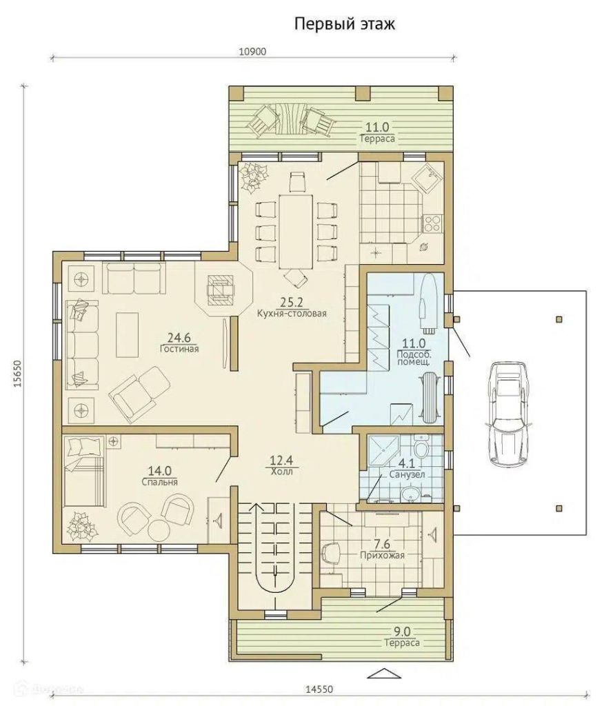 - Кухня‑столовая (25,2 м2) — место, где рождаются кулинарные шедевры и семейные разговоры. А ещё отсюда можно выскочить на террасу (11 м2) — вдохнуть свежего воздуха и подумать: «Как же тут хорошо!»