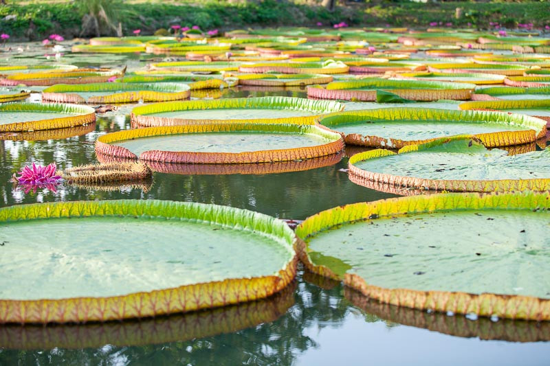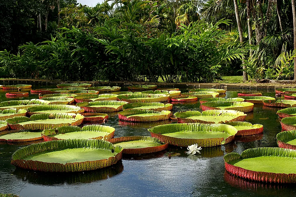 – Визуальная доминанта: Гигантские листья создают впечатляющий контраст с другими водными растениями.