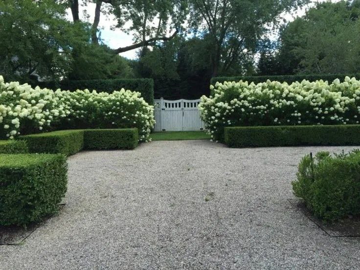 – Средние (1–1,5 м) идеальны для отделения зон отдыха от хозяйственных площадок. Можно использовать цветущие виды: гортензии, спиреи, чубушник.