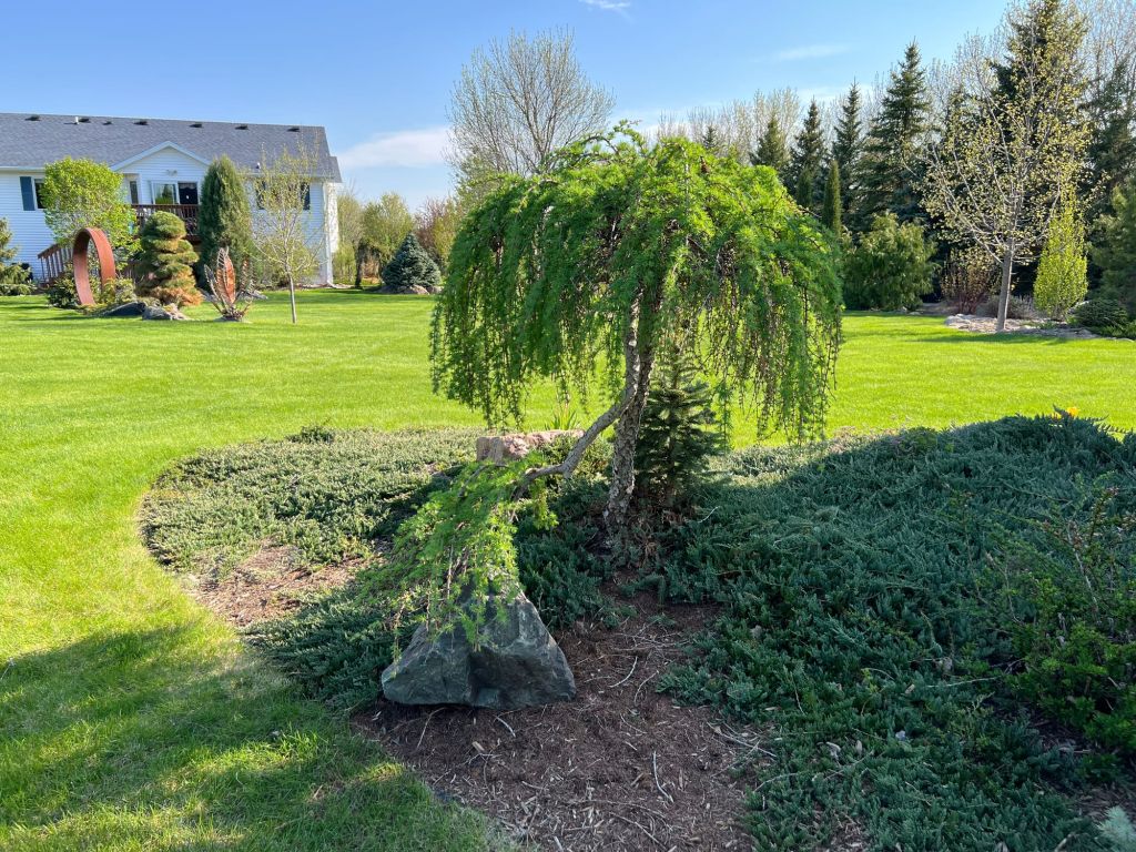 – Лиственница плакучая часто становится центральным акцентом в саду. Её изящная крона и сезонная смена окраски (от светло-зелёной летом до золотистой осенью) создают эффектный визуальный центр.