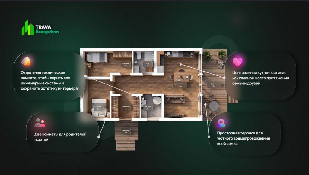 • кухня‑гостиная: 25 кв. м с выходом на террасу;