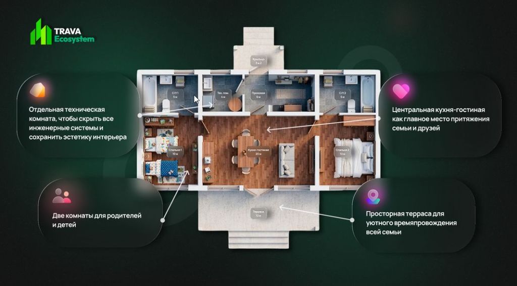 - терраса: 12 кв. м — идеальное место для утреннего кофе и вечерних посиделок;