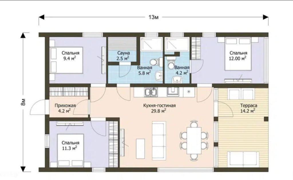 Представьте дом, в котором вы не заблудитесь, не устанете подниматься по лестницам и при этом почувствуете себя как в скандинавском триумфе уюта. Это «Дания 2.0» — одноэтажный шедевр, где 93,4 м² комфорта упакованы в 104 м² застройки. То есть даже снаружи видно: тут всё продумано!