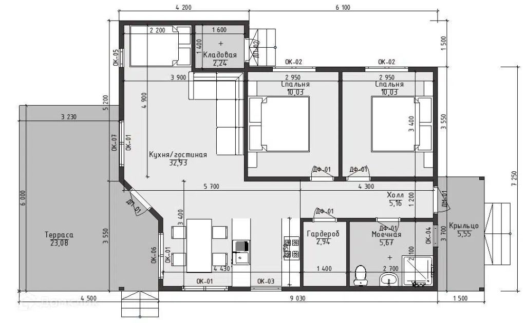 Никаких компромиссов: у каждого — своё уютное пространство. Одна комната может стать спальней, вторая — кабинетом или детской. А если приехали друзья, им тоже будет где отдохнуть. - Терраса 23,08 м2 — ваш летний оазис
