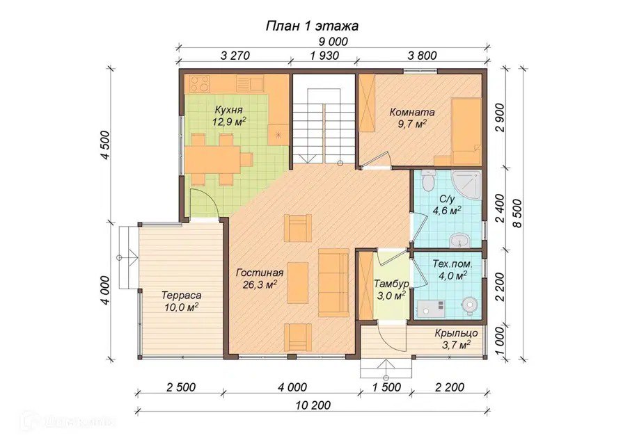 - Первый этаж: общая зона (гостиная, кухня, столовая), гостевой санузел, входная группа.