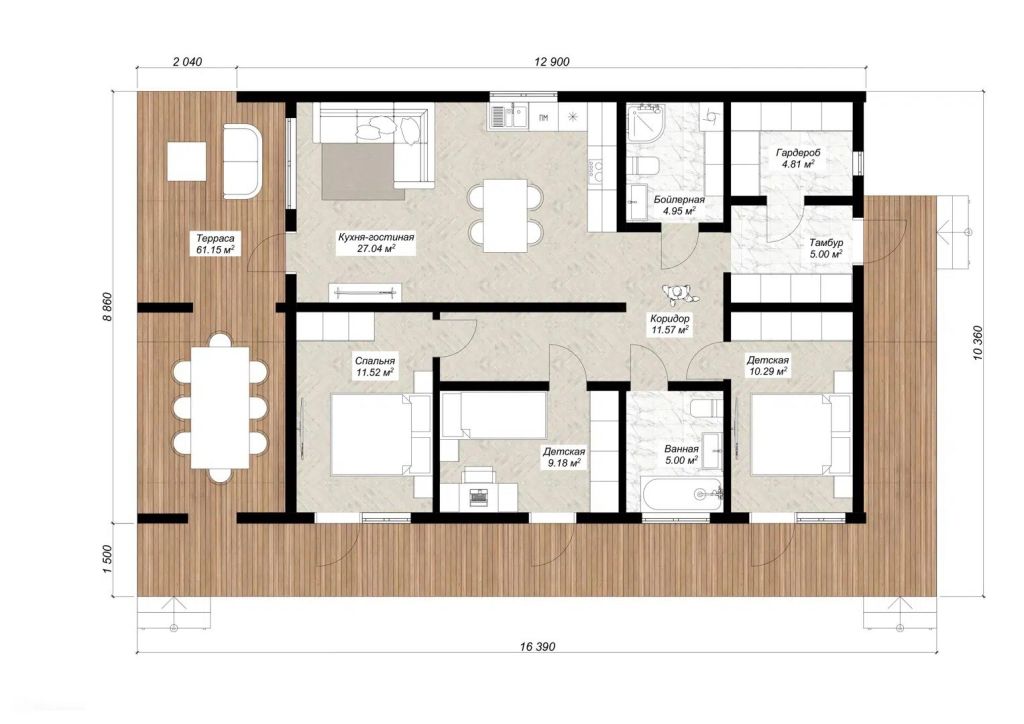 Общая площадь дома – 150 м²