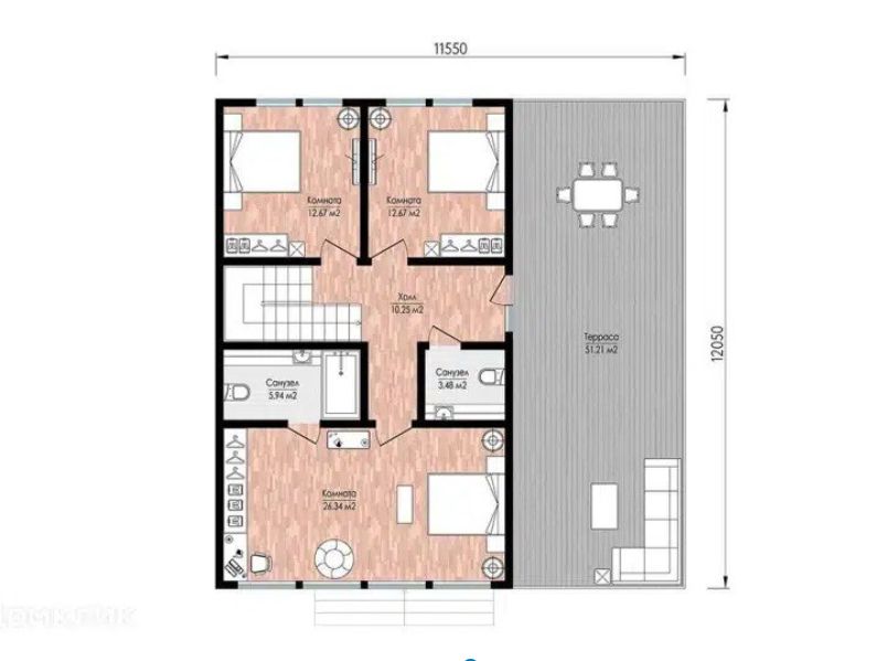 Второй этаж: зона отдыха и приватности. Здесь разместятся: