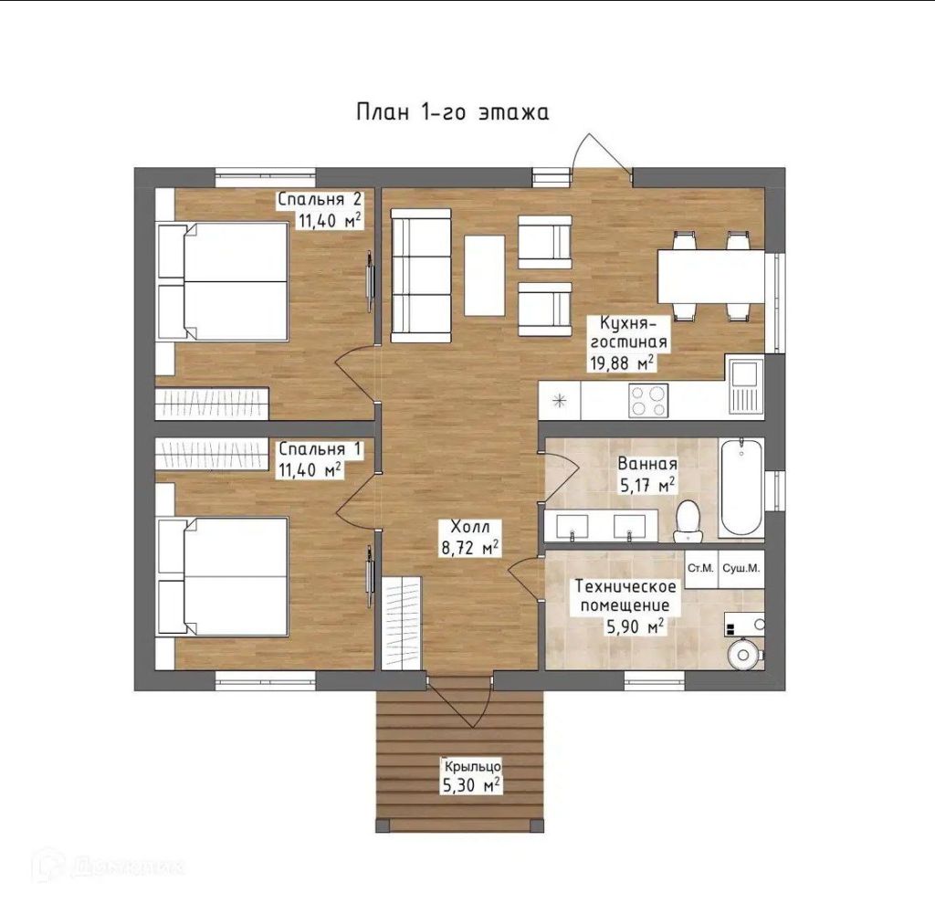 - Общая площадь — 62,4 м2. Не дворец, но и не скворечник! Ровно столько, чтобы разместить всё нужное и не тратить выходные на уборку каждого угла.