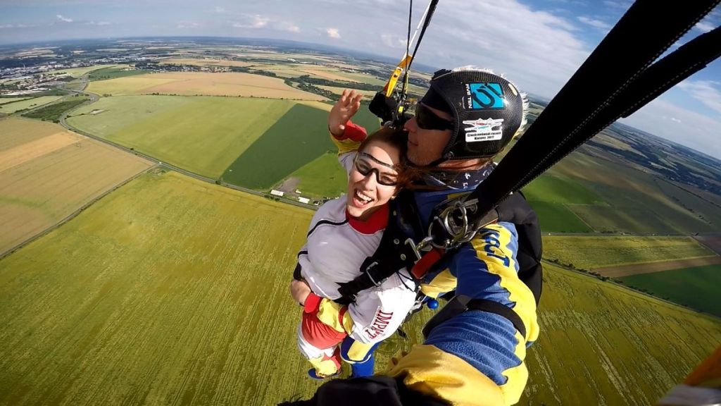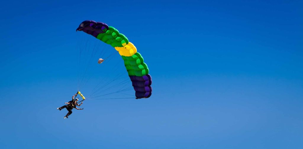 - Тандем‑прыжок с высоты около 3 км — свободное падение длится около минуты, а затем — плавное снижение под куполом.