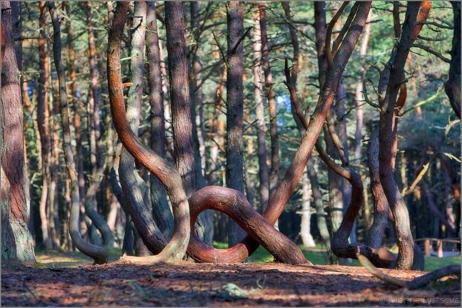 Представьте лес, где сосны словно замерли в причудливом танце. Их стволы изогнуты в самые невероятные формы — будто деревья решили устроить волшебный бал и закружились в вихре танца. Учёные до сих пор гадают, что стало причиной такой необычной формы, а туристы с удовольствием фотографируются среди этих сказочных «танцоров».