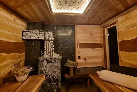 - Для ценителей традиций — настоящая русская баня с вениками, купелью и горячим чаном.