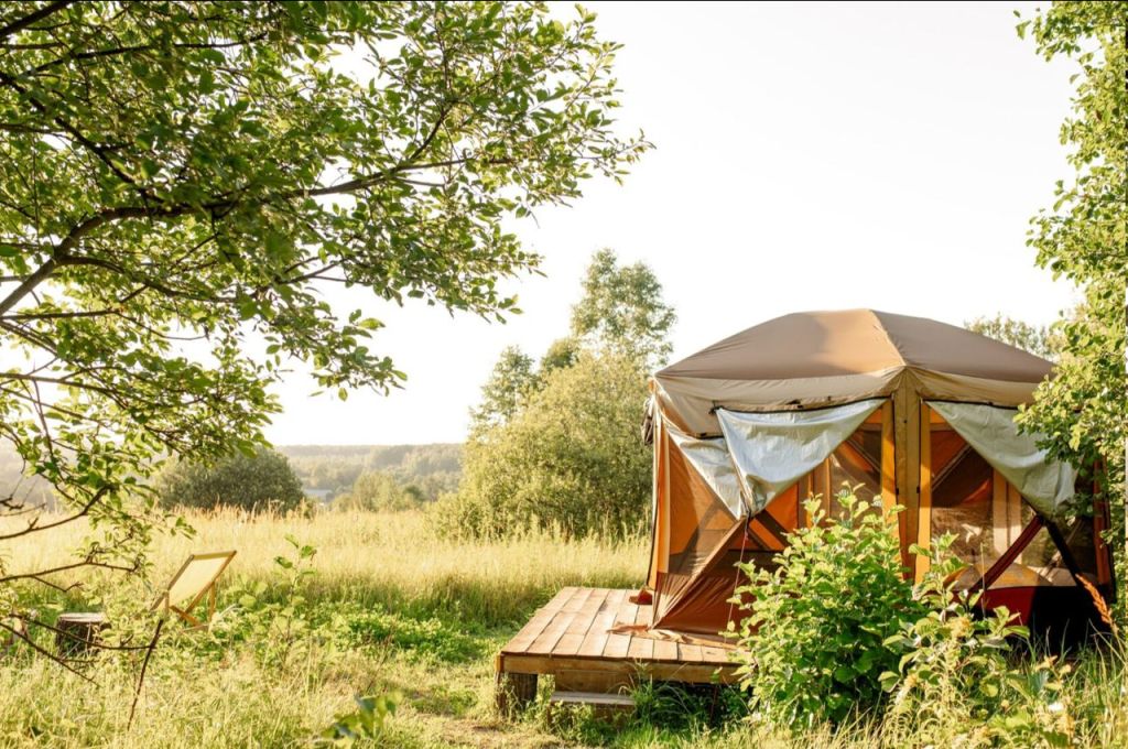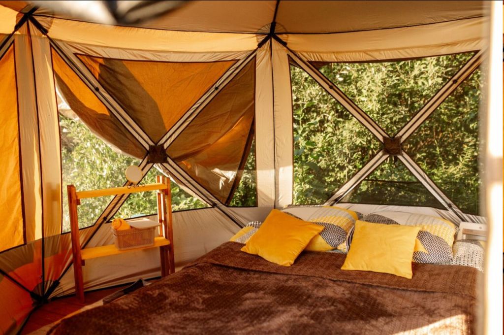 Это не обычный формат глэмпинга, отдых сочетает в себе размещение в комфортных сафари – тентах и наблюдение за планетами и звездами в телескоп. На территории расположены: амфитеатр-кинотеатр, наблюдательная площадка, открытая кухня, костровая и мангальная зоны, выставки, арт объект “Хаббл”, библиотека. В комфортных шатрах есть всё необходимое, включая электричество и обогреватели. Санузел и душ — общие. Открытая кухня – палатка с готовой замороженной едой от Вкусвилл и техника для разогрева/приготовления. Берите с собой тёплые вещи, так как ночи могут быть холодными, а лучшее время наблюдения за звездами в это время. Планируйте визит заранее, места в сезон раскупаются на 3 недели вперёд, а на яркие астрособытия за 1-2 месяца.