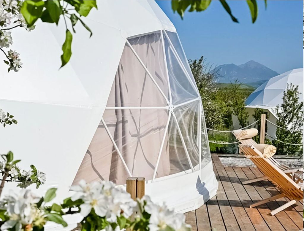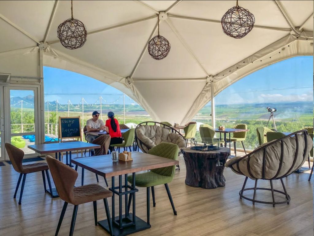 Локация расположена в живописном месте, у подножия горы Верблюд. На территории находится всего 10 куполов. Они размещены на комфортном расстоянии, не позволяющем нарушить ваш покой. При строительстве глэмпинга максимально сохранили ландшафт и природу окружающей территории На территории не предусмотрена мангальная зона. Для вашего удобства на территории глэмпинга работает небольшой уютный ресторан с видом на Эльбрус. Профессиональный шеф-повар приготовит для вас вкусные блюда национальной и европейской кухни.