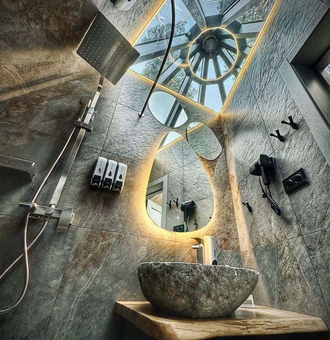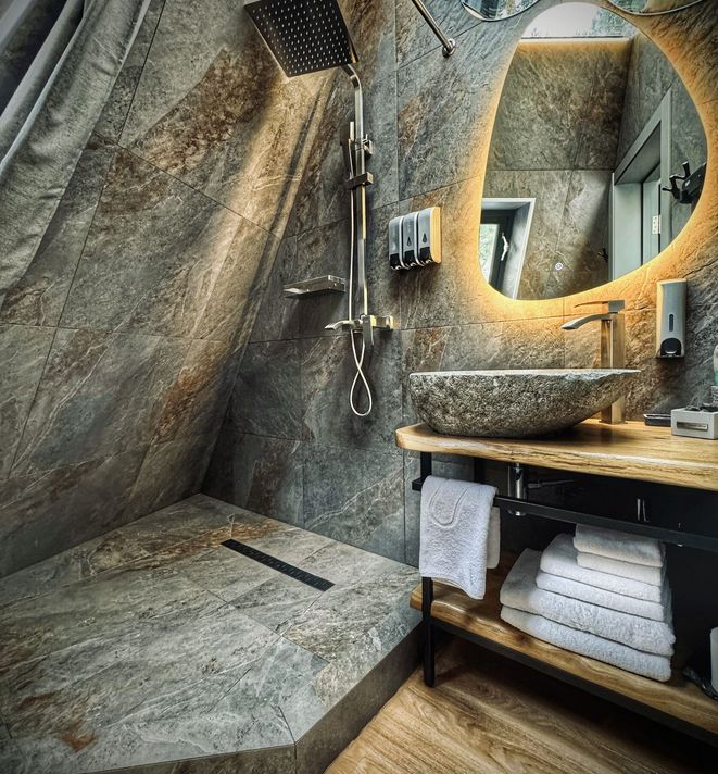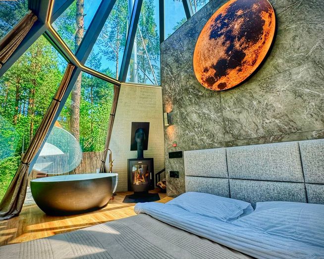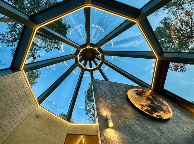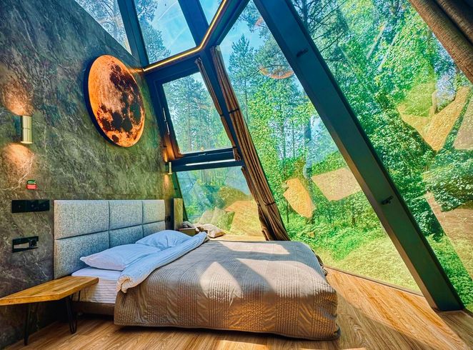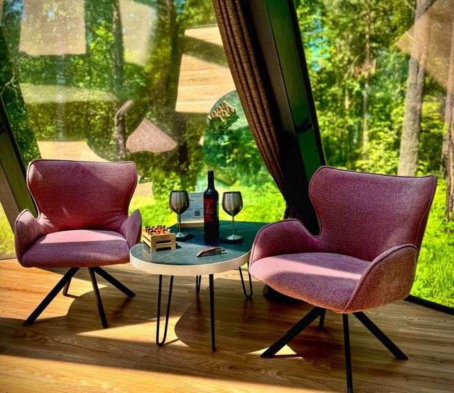 Дом имеет большие панорамные окна по всему периметру, для наслаждения приватным реликтовым лесом , окружающей природой, голубым небом, звездами, стекающими каплями дождя и хлопьями снега. Дизайнерский ремонт в стиле хай-тек, подчеркивает величественность и изящность дома. Весь интерьер, мебель и материалы высочайшего класса, подобраны с особым вниманием, для создания максимального релакса и удовольствия. Комфортное размещение для 3 х гостей, общая площадь 48 кв.м (жилая 32 кв.м, приватная терраса 16 кв.м).
