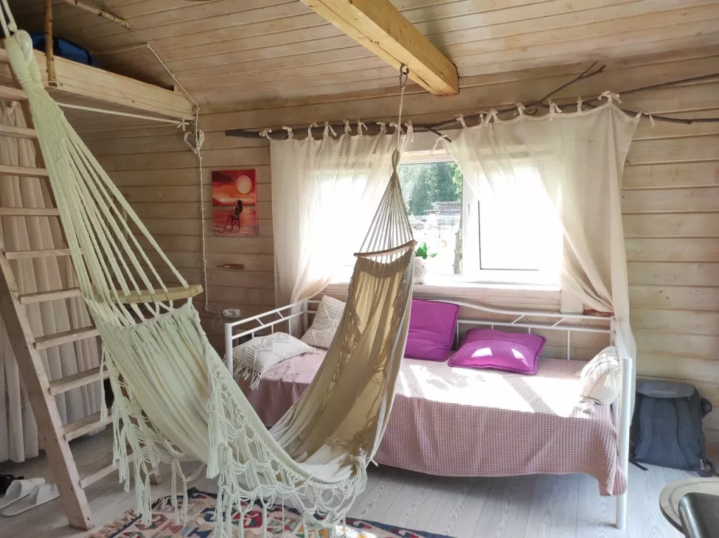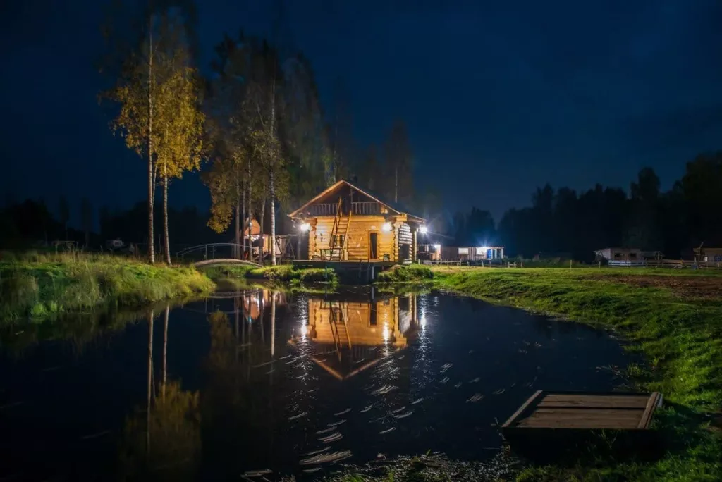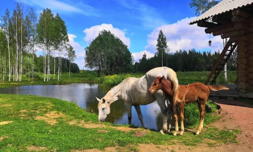 Уникальные домики, в каждом свой тематический интерьер. Гостей здесь кормят фермерскими продуктами собственного производства (питание необходимо заказывать за день до заезда). Русская баня на дровах у лесного пруда. По территории гуляют в свободном доступе: козочки, лошади, пони, птицы, утки, кошечки, коровы. Верховая езда. Мастер-классы по гончарному мастерству, живописи на спилах и вязанию из жгута (по предварительной записи).