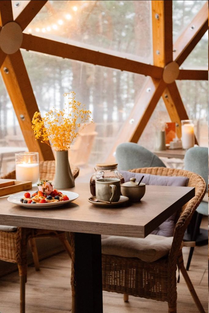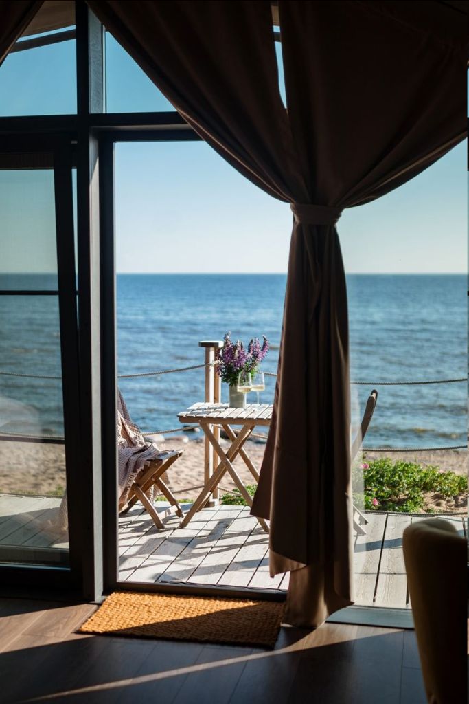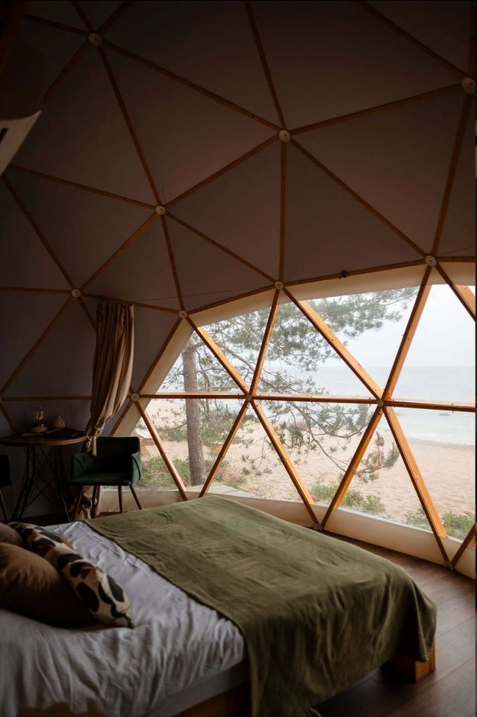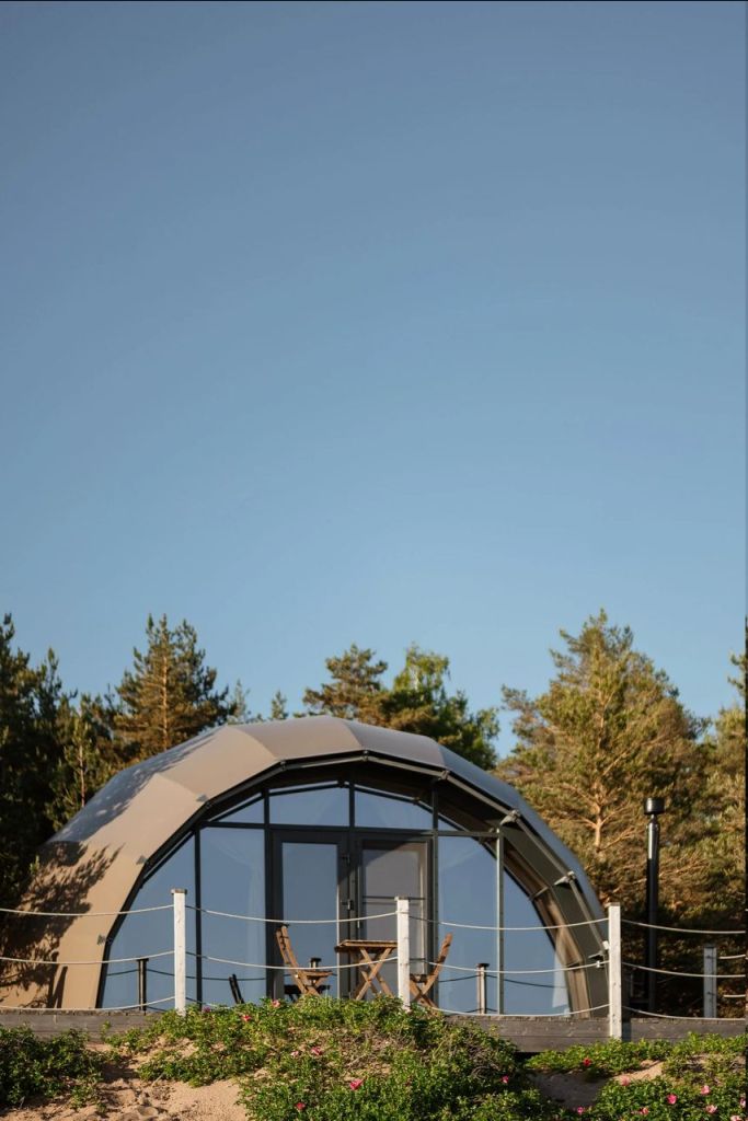 Глэмпинг расположен на берегу Финского залива. Расположиться можно в круглогодичных геокуполах или комфортных шатрах (в летний сезон). Во всех куполах есть две двуспальных кровати, мини-кухня без электрической плиты, но с микроволновой печью и холодильником. Внутри теплые полы и дровяная печь для комфортного отдыха даже в холодное время года. Санузел и душевая в самом куполе. В шатре есть электричество и розетки, двуспальная кровать и дополнительное кресло, столик, чайник, холодильник и посуда, есть запас питьевой воды. Комофртный санузел и душевая рядом с каждым шатром. Также есть 3 бани и у каждой находится купель. Две из них с панорамными окнами с видом на Финский залив расположены на границе с пляжем и еще одна баня находится в сосновом лесу.