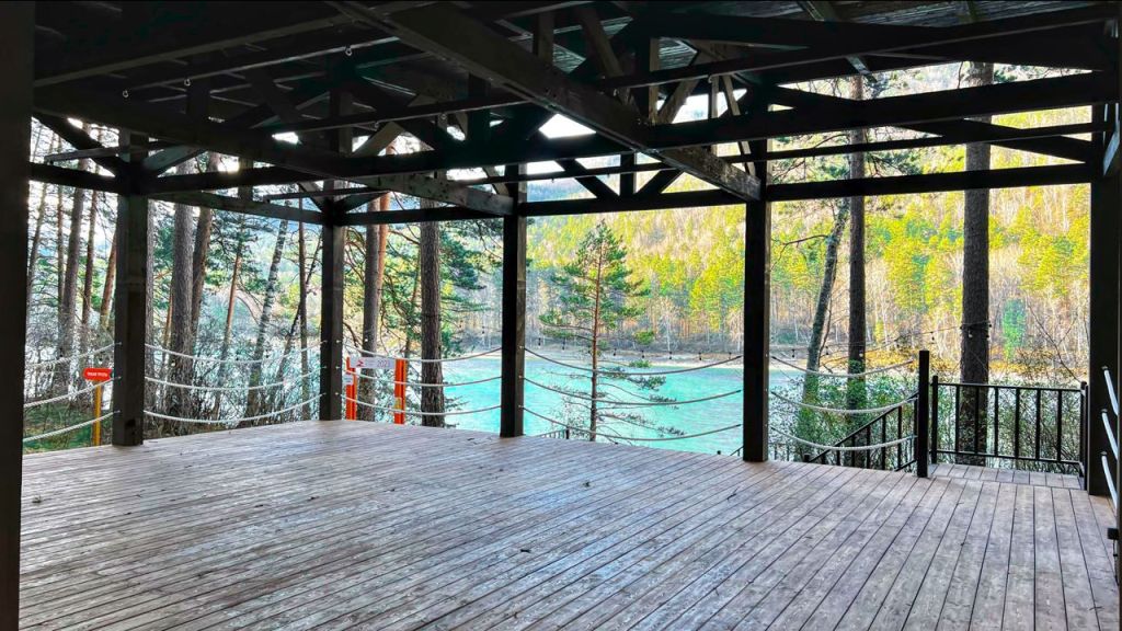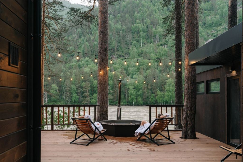 На открытой площадке с крышей и видом на Катунь можно заниматься йогой, любоваться природой или забронировать пространство для любого мероприятия.