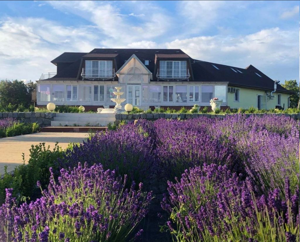 Загородная усадьба с большим лавандовым полем, яблочным садом, озером и участком, где выращивают овощи.